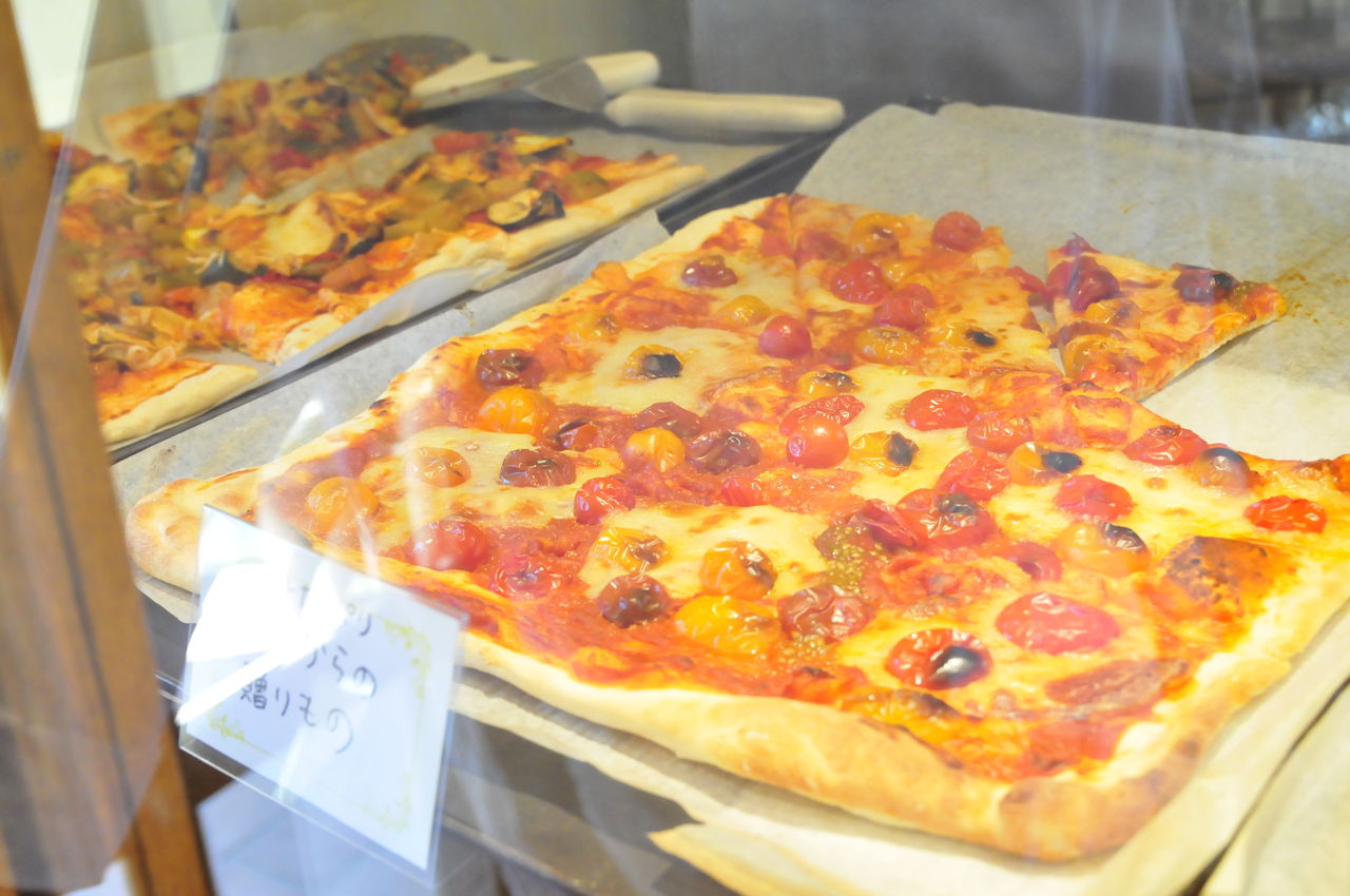 隣にある“ポモドーロ”は手作りのケーキやパン、計り売りのピザが並んでいます