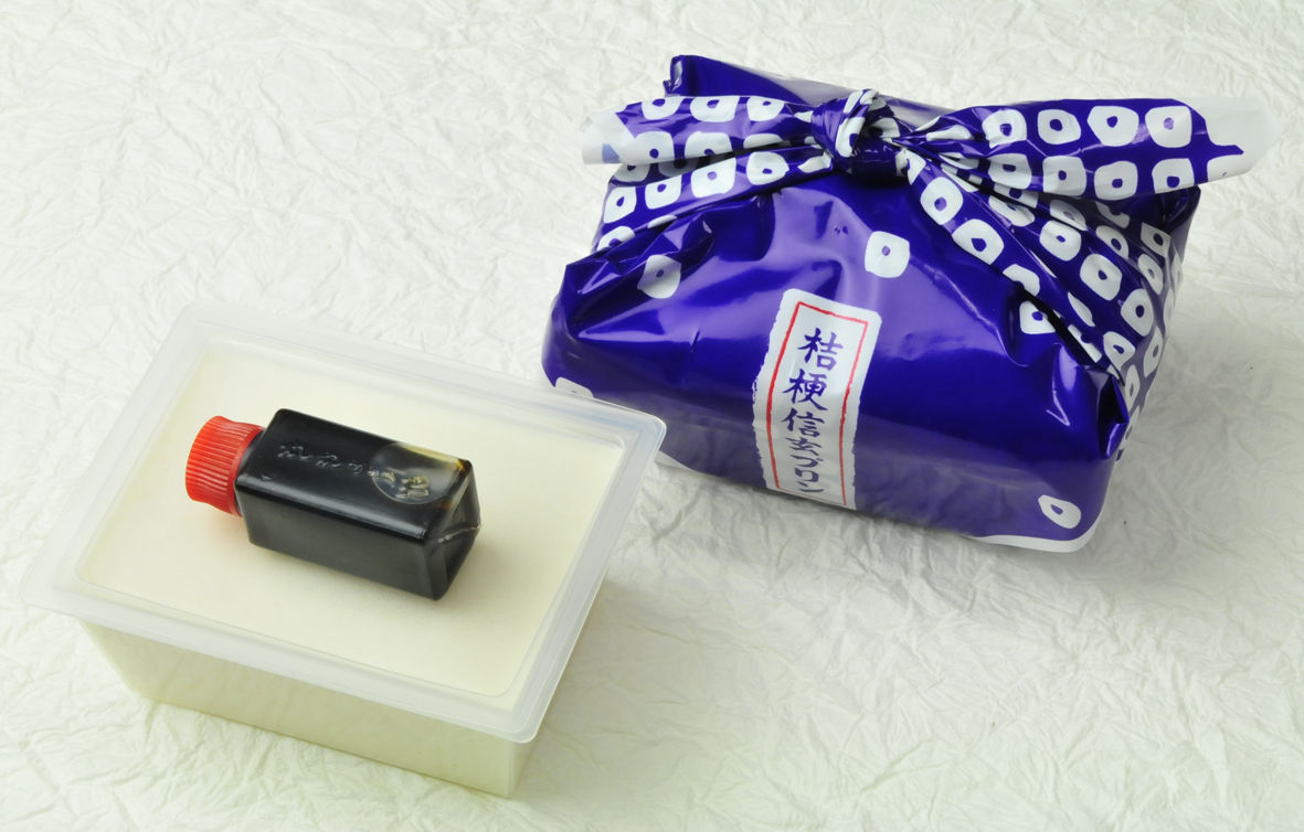 この風呂敷包みと黒蜜がきな粉プリンのフタの上にのっているスタイルは、