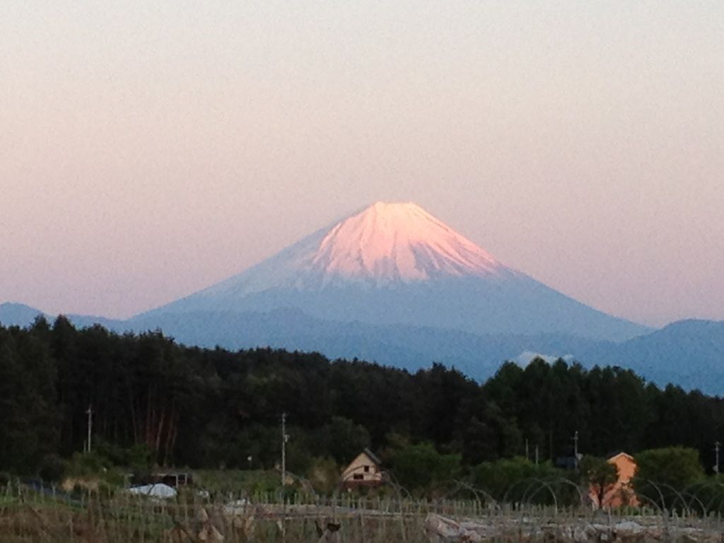 淡い青色の富士山にふんわりとピンク色の西日がさしていて、とても綺麗でした。