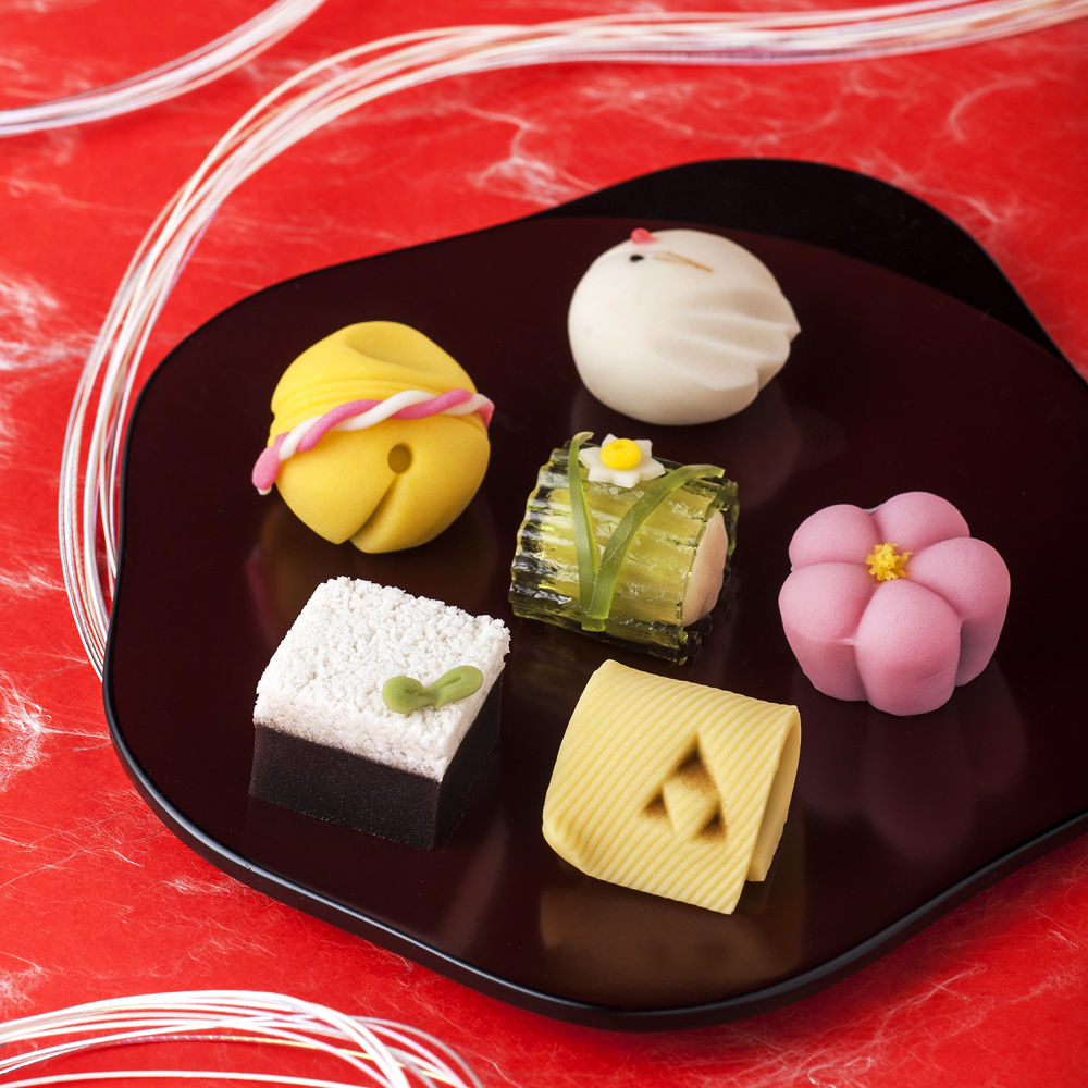 右前にある黄色の上生菓子は、来年の干支「巳」をイメージしたものです。
